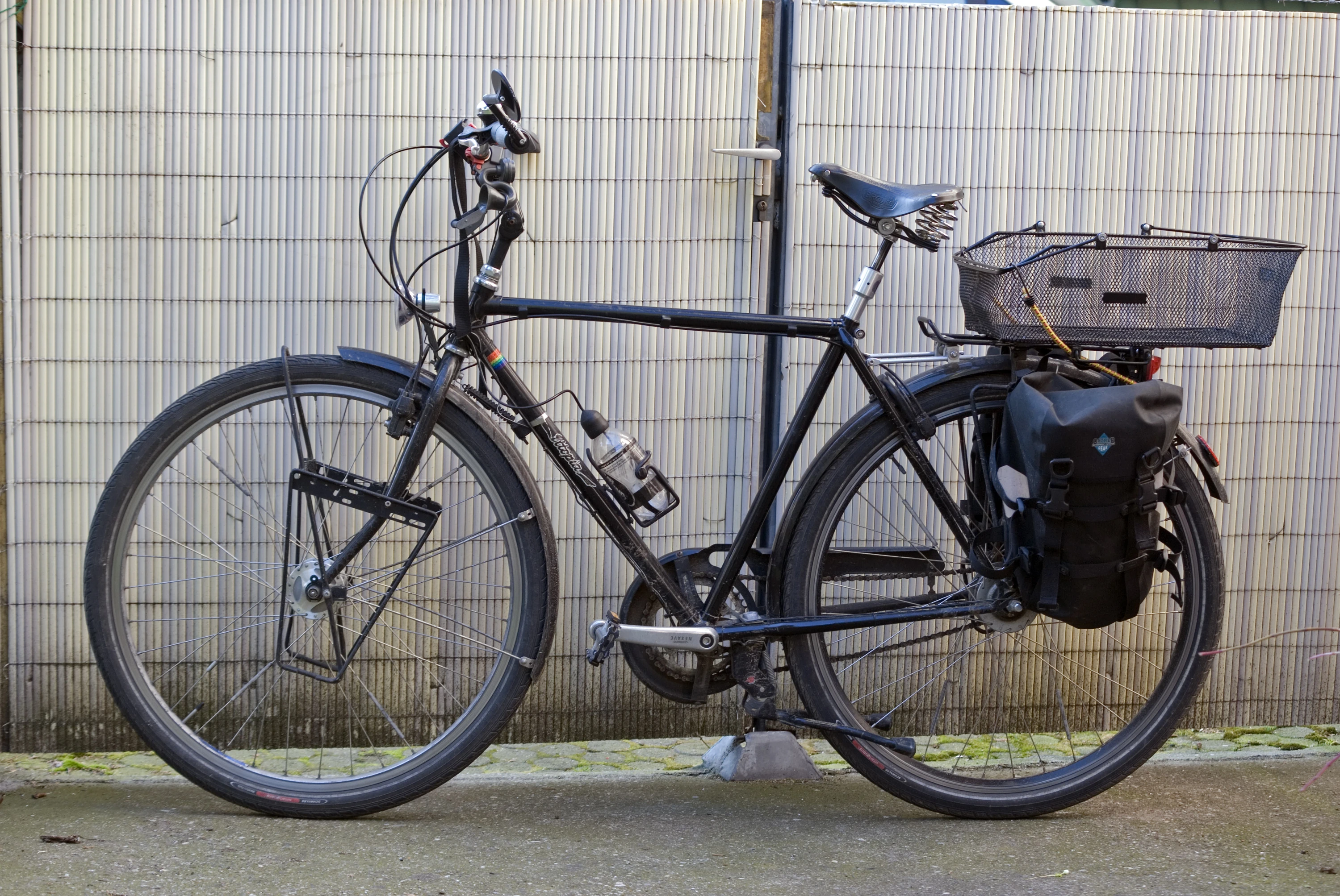 Randonneur mit Nabendynamo und Sattel- und Lenkertasche.